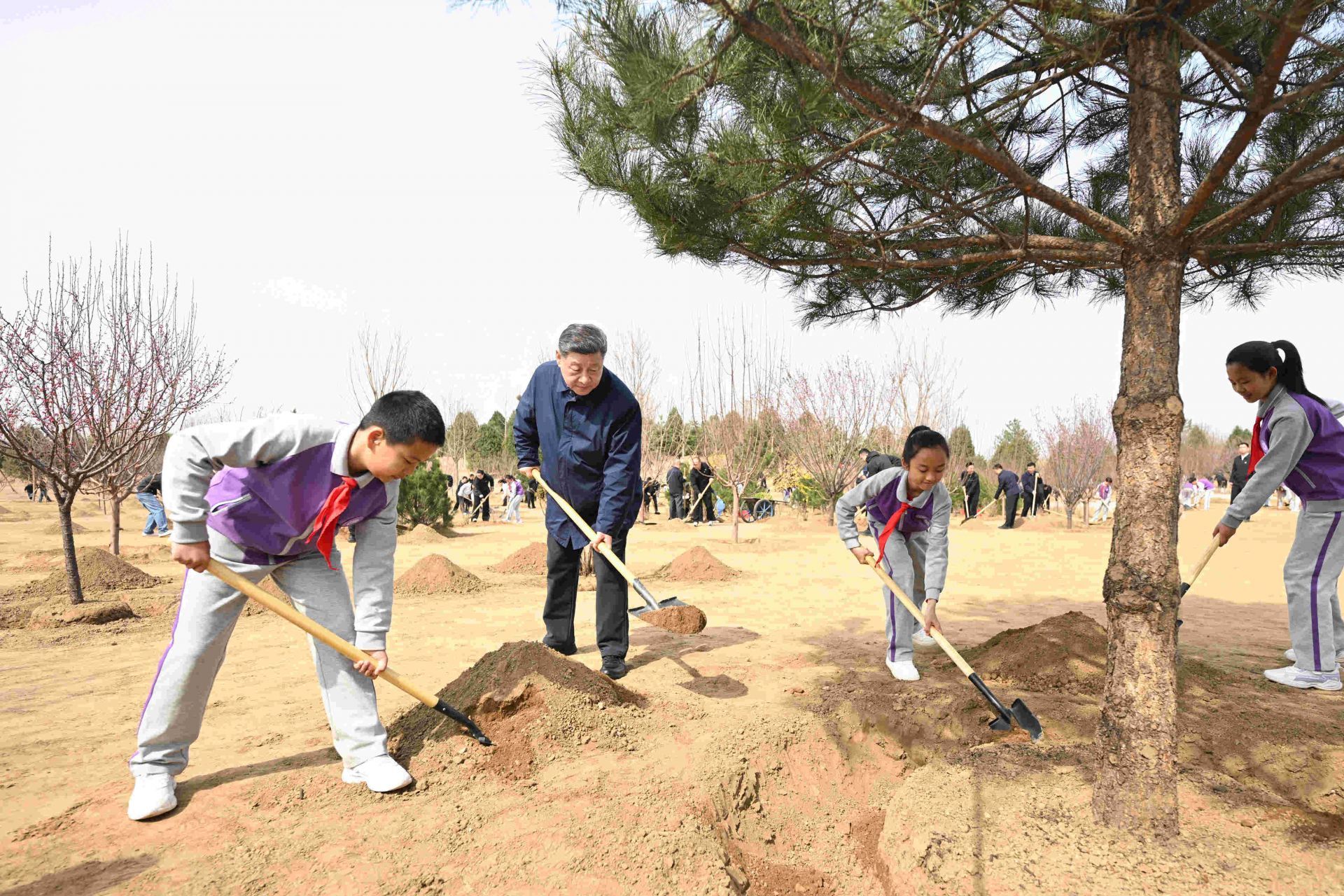 挥锹铲土、培土围堰、提水浇灌……习近平接连种下油松、北京牡丹、榆叶梅、杜仲、元宝枫等多棵树苗。他一边植树,一边询问孩子们的学习生活、劳动锻炼和参加植树情况。习近平强调,青少年像小树苗一样充满活力和希望,要从小树立远大志向,爱知识、爱劳动、爱自然,德智体美劳全面发展,努力成长为栋梁之材。现场气氛热烈,一派繁忙景象。